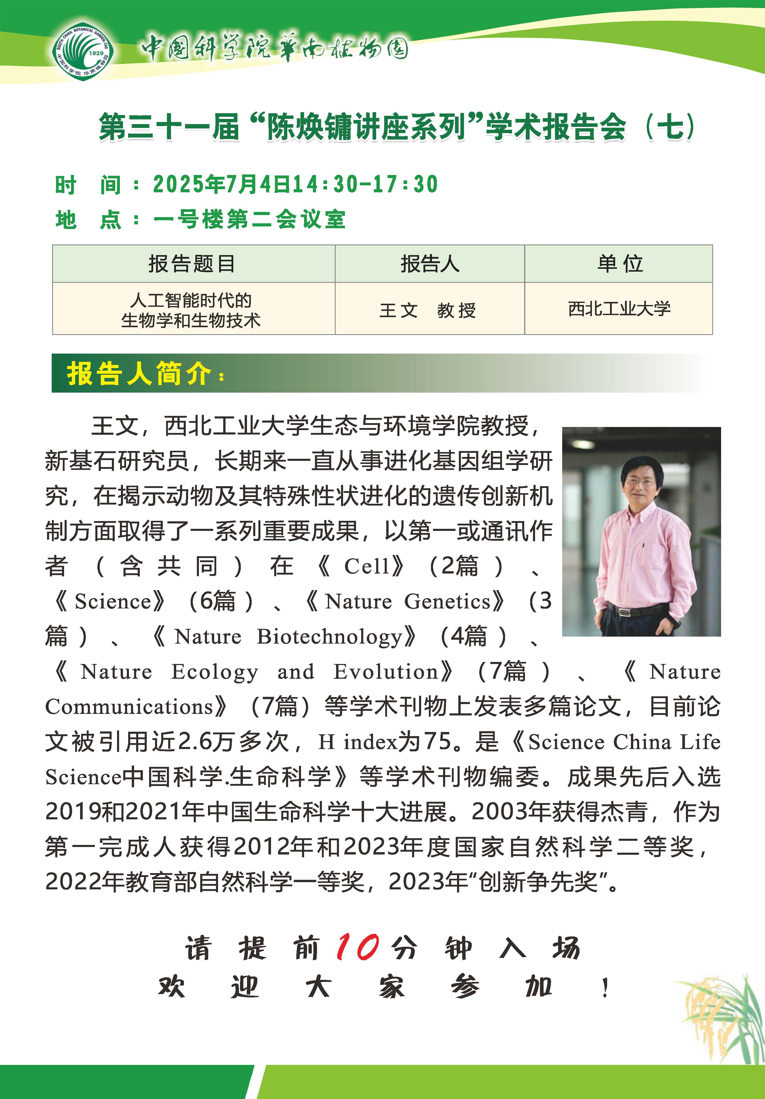第三十一届 “陈焕镛讲座系列”学术报告会(七,王文,7月4日14:30开始)